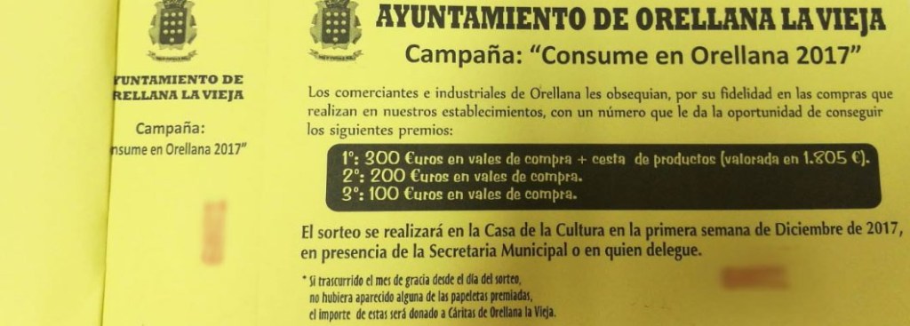 Se trata de la campaña “consume en Orellana 2017” que comenzó el pasado 1 de junio y continuará hasta el próximo 30 de noviembre. Los establecimientos participantes, 50 en total, han repartido 20.000 papeletas entre sus clientes por cada compra efectuada superior a 5 euros.Esta campaña está organizada por la concejalía de desarrollo local y pretende fomentar el consumo local en los establecimientos comerciales, de servicios personales y hosteleros locales. Una campaña cuyo fin es concienciar de que el consumo local ayuda a mantener el empleo y crear riqueza en la población. Hay importantes premios a repartir.