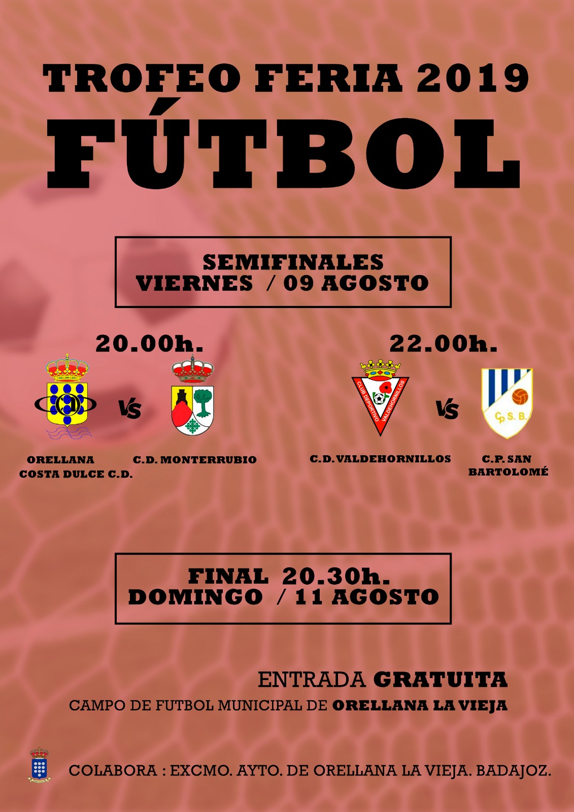Tras el primer encuentro del conjunto Orellana Costa Dulce donde se produjeron buenas sensaciones, tenemos el trofeo de Feria 2019 con semifinales el Viernes 9 de Agosto con doble partido a las 20:00 horas: Orellana Costa Dulce C.D. – Monterrubio C.D. y a las 22 horas: C.D. valdehornillos – C.P. San Bartolomé.
