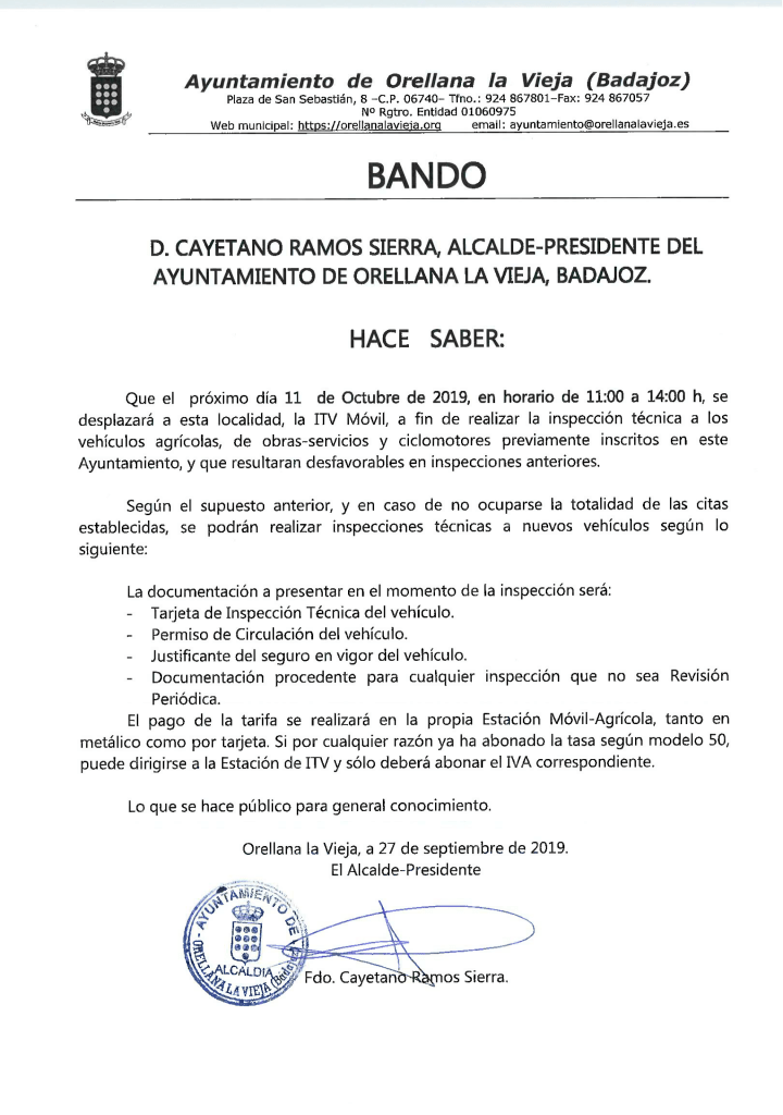 BANDO: ITV móvil en Orellana la Vieja para vehículos que no la pasaran con anterioridad