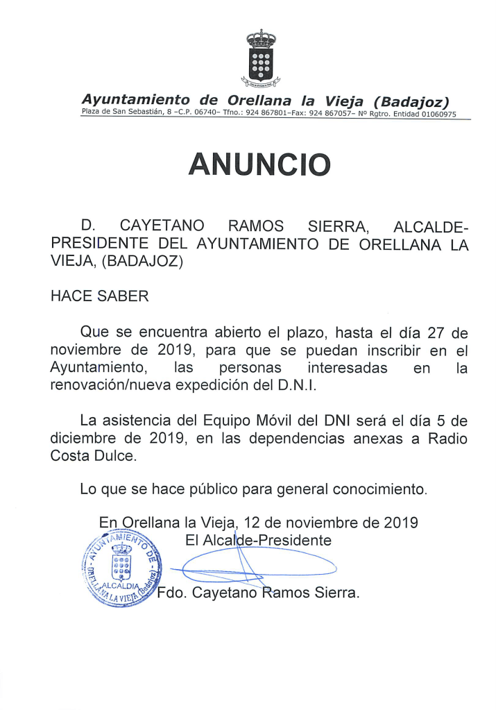 Hasta el 27 de noviembre 2019 estará abierto el periodo para que los interesados en renovar el DNI lo puedan hacer en Orellana la Vieja. Se puede solicitar más información en las oficinas municipales.