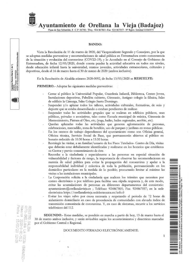 SEGÚN RESOLUCIÓN DE ALCALDÍA 2020-0092, Y DEBIDO A LA CRISIS DEL CORONAVIRUS, SE PUBLICAN LAS OBLIGACIONES Y RECOMENDACIONES A SEGUIR POR TODA LA CIUDADANÍA. SE RUEGA LA MÁXIMA RESPONSABILIDAD SOCIAL.
