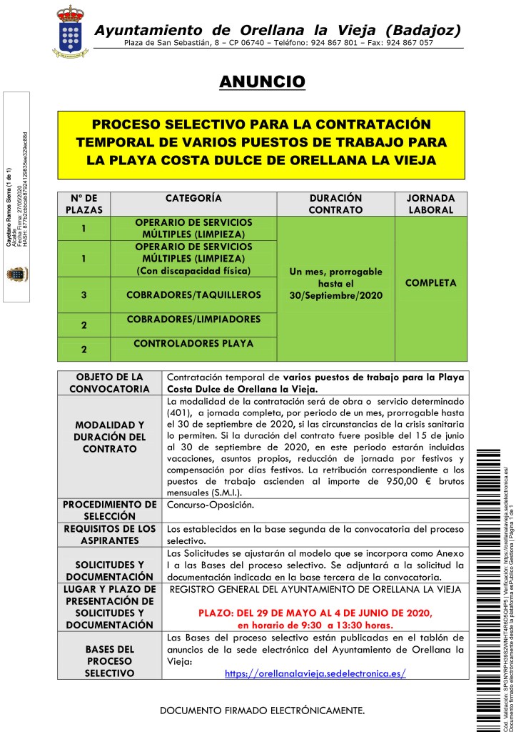 ANUNCIO- proceso selectivo para la contratación temporal de varios puestos de trabajo para la Playa Costa Dulce de Orellana la Vieja