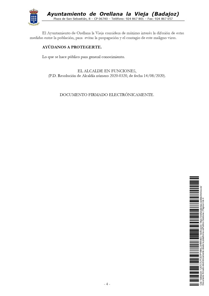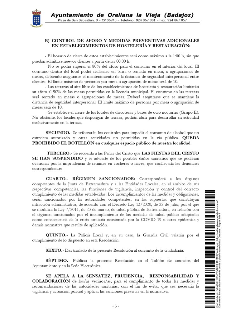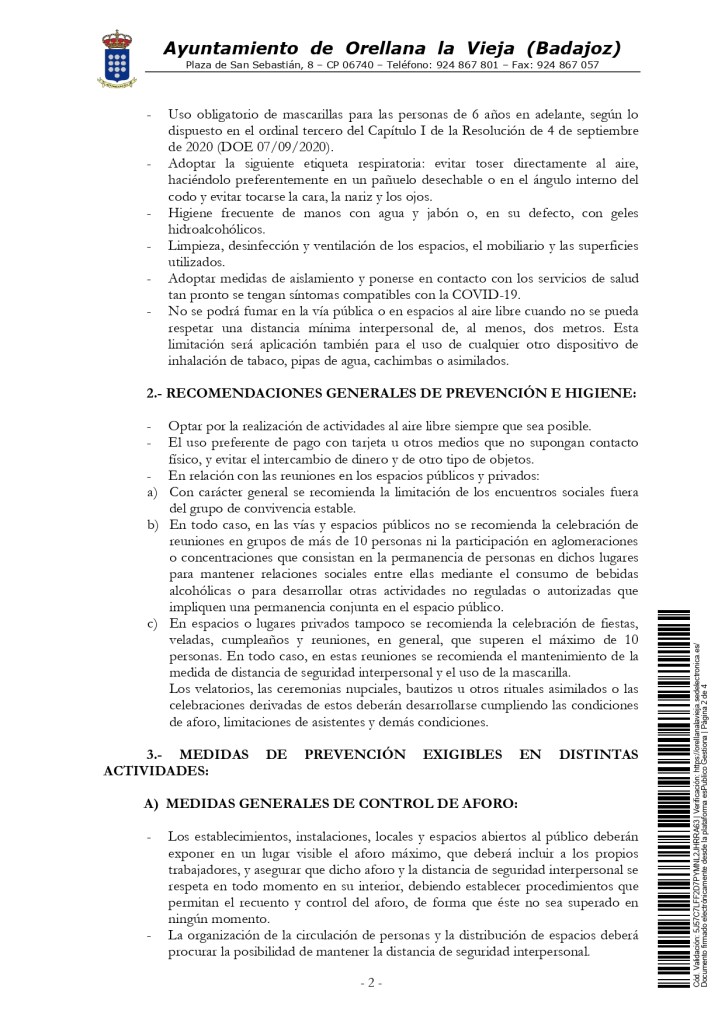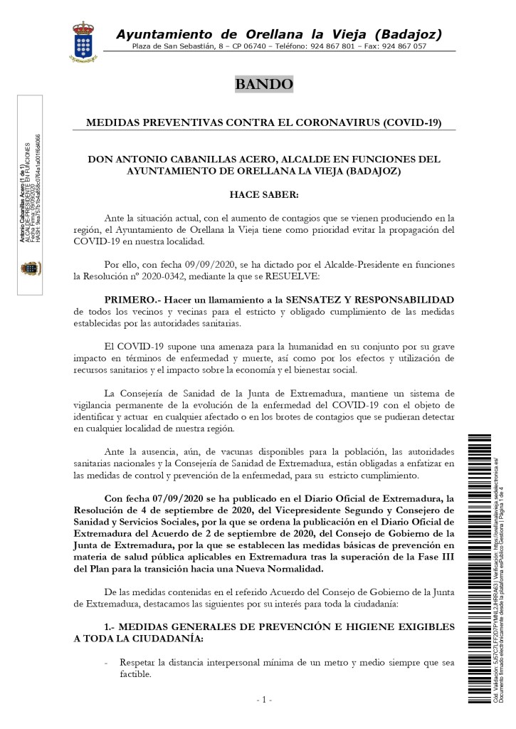 Para más información con respecto a las medidas preventivas, consultar la RESOLUCIÓN de 4 de septiembre de 2020, del Vicepresidente Segundo y Consejero, por la que se ordena la publicación en el Diario Oficial de Extremadura del Acuerdo de 2 de septiembre de 2020, del Consejo de Gobierno de la Junta de Extremadura, por el que se establecen las medidas básicas de prevención en materia de salud pública aplicables en Extremadura tras la superación de la Fase III del Plan para la transición hacia una Nueva Normalidad.