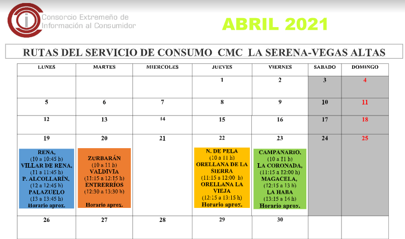 Los días sin ruta por los diferentes pueblos, será posible la atención presencial (con cita previa), telemática o telefónica en la oficina central de Villanueva de la Serena en horario de 9:00 a 14:00 horas.