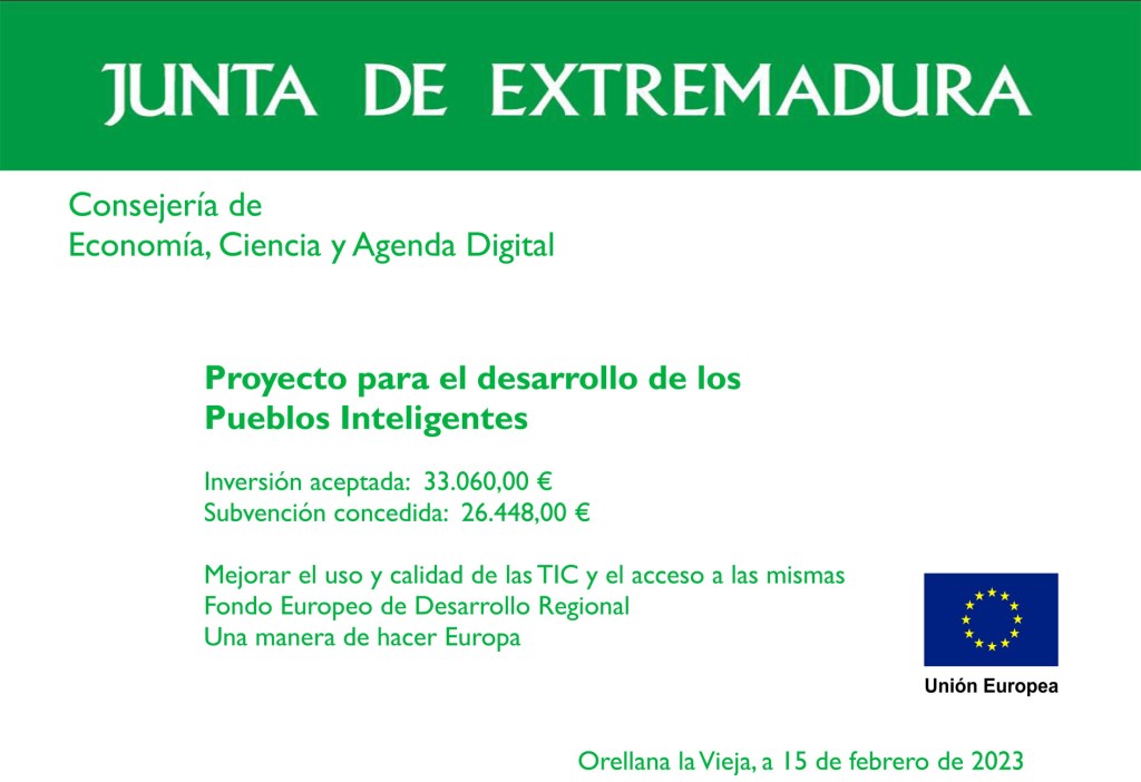 El Ayuntamiento de Orellana la Vieja ha recibido una subvención para la realización de proyecto de promoción turística con base tecnológica. Así se ha decidido invertir en varias soluciones que complementan el trabajo realizado hasta la fecha.