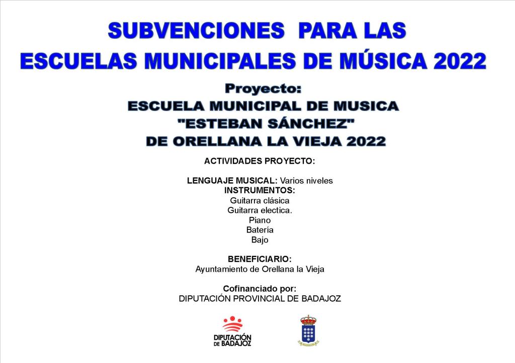 Mediante Resolución de la Secretaría General del Área de Cooperación Municipal y coordinación de la delegación de Cultura y Deportes, de fecha 18 de febrero de 2022, se concedió al Ayuntamiento de Orellana la Vieja una subvención para la Escuela Municipal de Música Esteban Sánchez” de Orellana la Vieja para 2022.