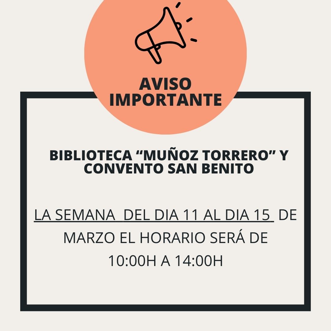Se informa que el horario del Convento de San Benito y de la Biblioteca Muñoz Torrero en la semana del 11 al 15 de marzo de 2024 será de 10:00 a 14:00 horas.