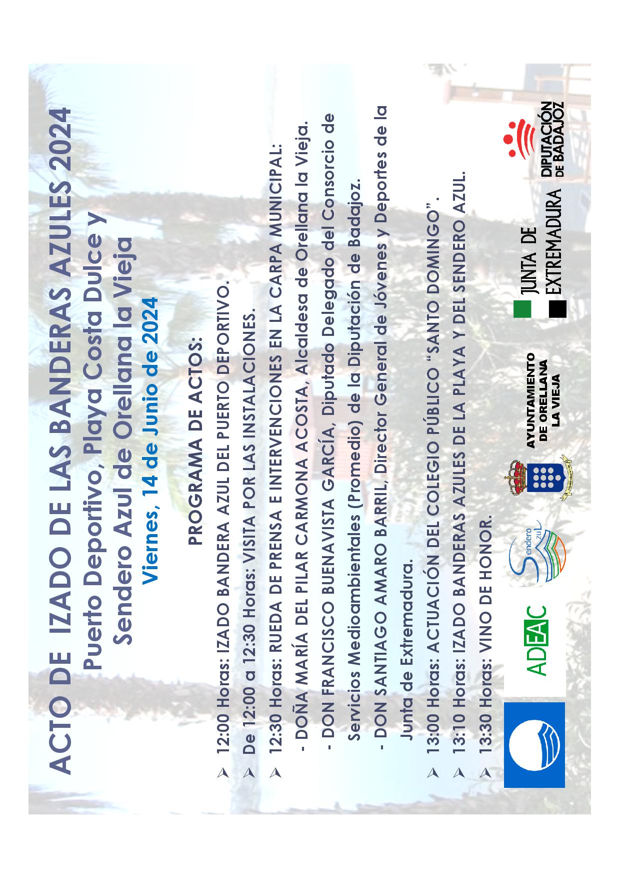 El Ayuntamiento de Orellana la Vieja invita a vecinos y usuarios de la Playa, Puerto y Sendero al Acto de Izado de Banderas Azules 2024 en Orellana la Vieja.