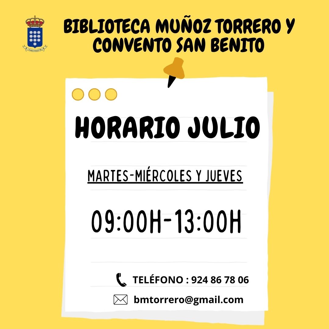 El Ayuntamiento de Orellana la Vieja informa que durante el mes de julio de 2024 el horario de Biblioteca y Convento será martes, miércoles y jueves de 9:00 a 13:00 horas.