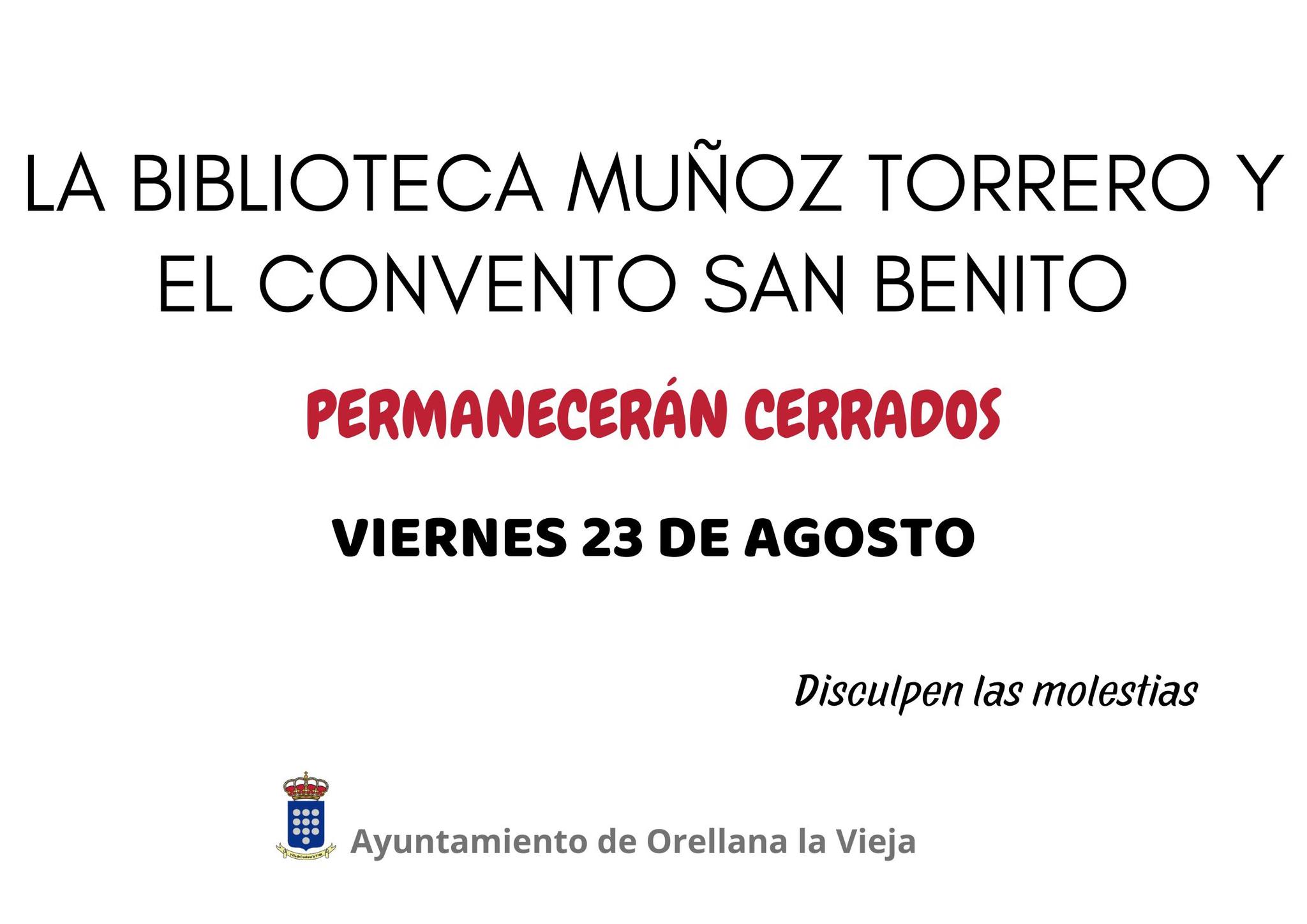 Este viernes 23 de agosto la Biblioteca Muñoz Torrero Orellana la Vieja y el Convento San Benito permanecerán cerrados.