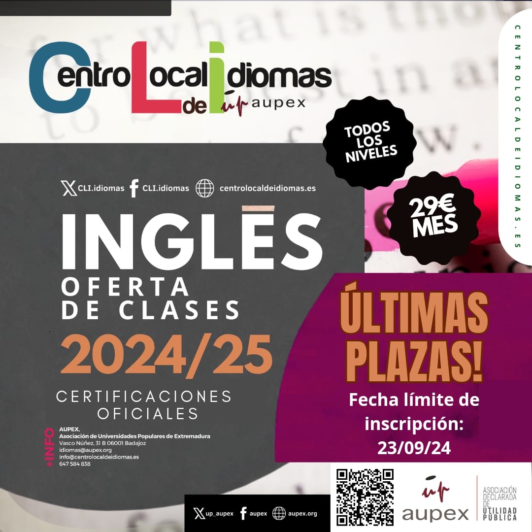 Ya está abierto el plazo de matriculación para el curso 2024-2025 en el Centro Local de Idiomas de Orellana la Vieja para la especialidad de inglés.