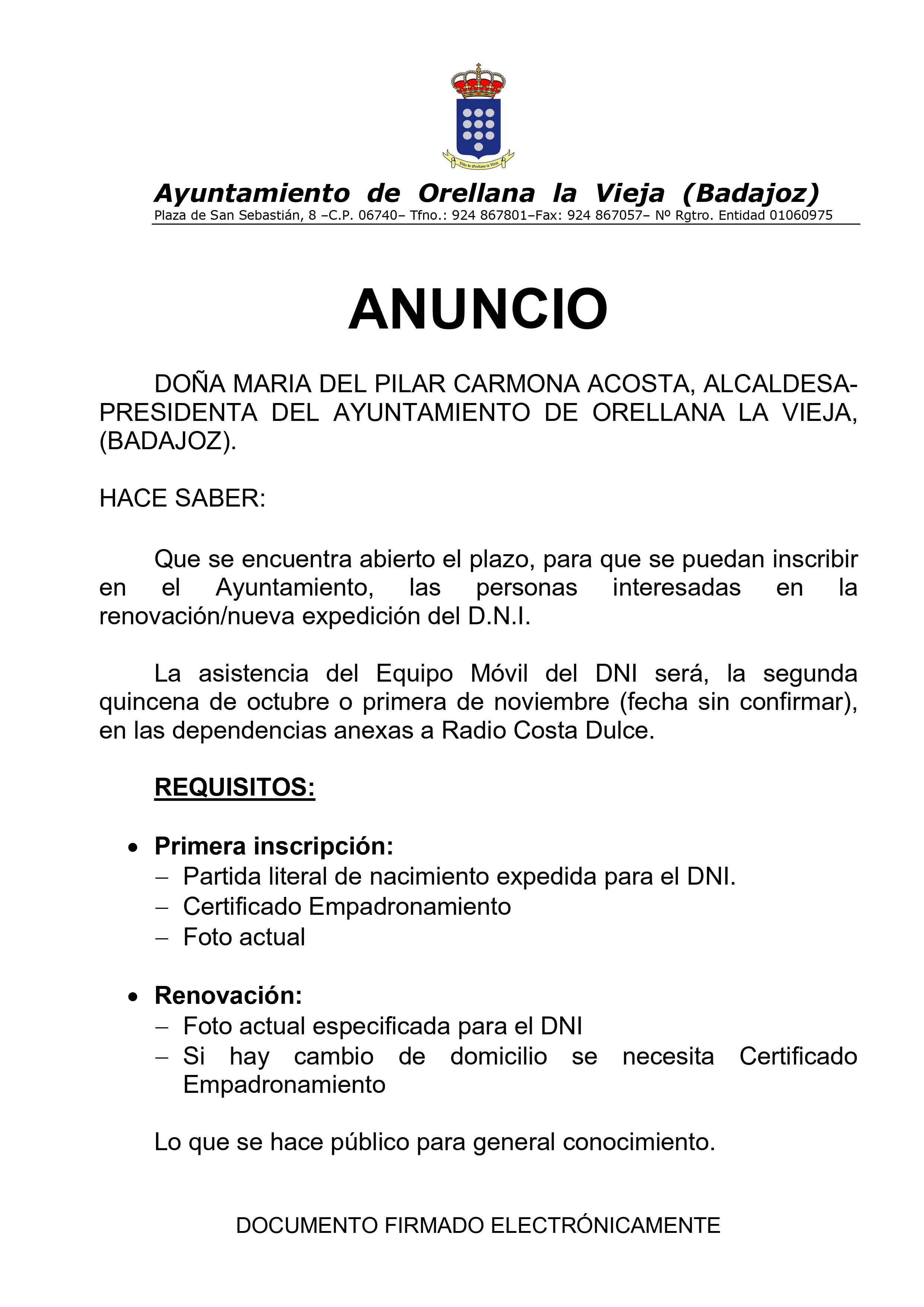 Ya se encuentra abierto el plazo, para que se puedan inscribir en el Ayuntamiento de Orellana la Vieja, las personas interesadas en la renovación o nueva expedición del D.N.I.