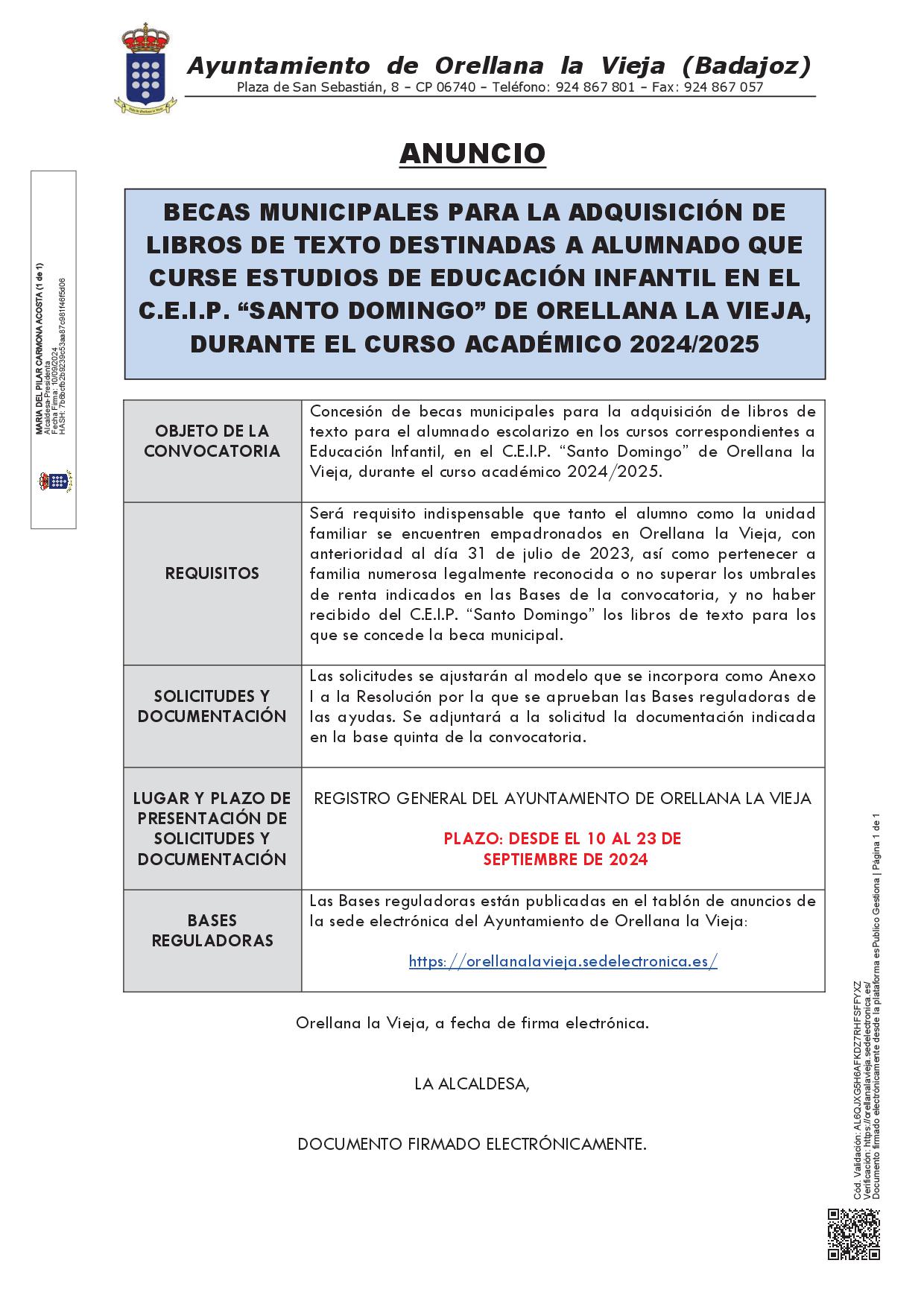 PUBLICADAS LAS BASES REGULADORAS DE LA CONCESIÓN DE BECAS MUNICIPALES PARA LA ADQUISICIÓN DE LIBROS DE TEXTO DESTINADAS AL ALUMNADO QUE CURSE ESTUDIOS DE EDUCACIÓN INFANTIL EN EL C.E.I.P. “SANTO DOMINGO” DE ORELLANA LA VIEJA, DURANTE EL CURSO ACADÉMICO 2024/2025.