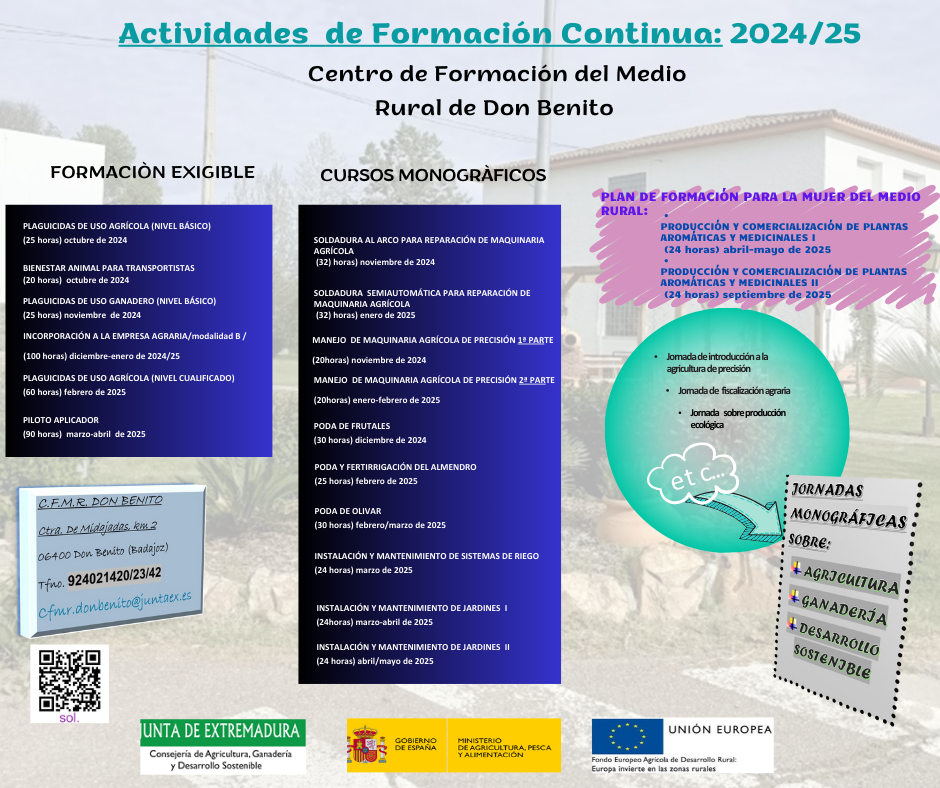El Centro de Formación del Medio Rural de Don Benito, dentro del Programa de Formación Profesional Continua, presenta la programación de actividades formativas dirigidas al sector agroganadero para el curso 2024/2025.