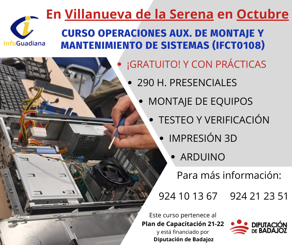 Desde el Servicio de Capacitación para el Empleo de la Diputación de Badajoz se pone en marcha el proceso de recepción de solicitudes para el curso GRATUITO de «OPERACIONES AUXILIARES DE MONTAJE Y MANTENIMIENTO DE SISTEMAS MICROINFORMÁTICOS». Un curso de 370 horas, divididas en 290 TEÓRICAS y las 80 restantes de PRÁCTICAS, y que se realizará en modalidad PRESENCIAL, EN HORARIO DE TARDE, en Villanueva de la Serena, encuadrada en el Plan de Capacitación para el Empleo 21-22.