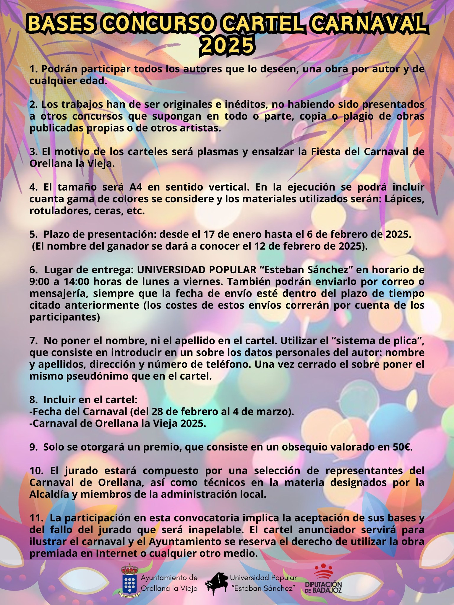 Se adjuntan las bases que han de regir el Concurso del Cartel de Carnaval 2025 en Orellana la Vieja