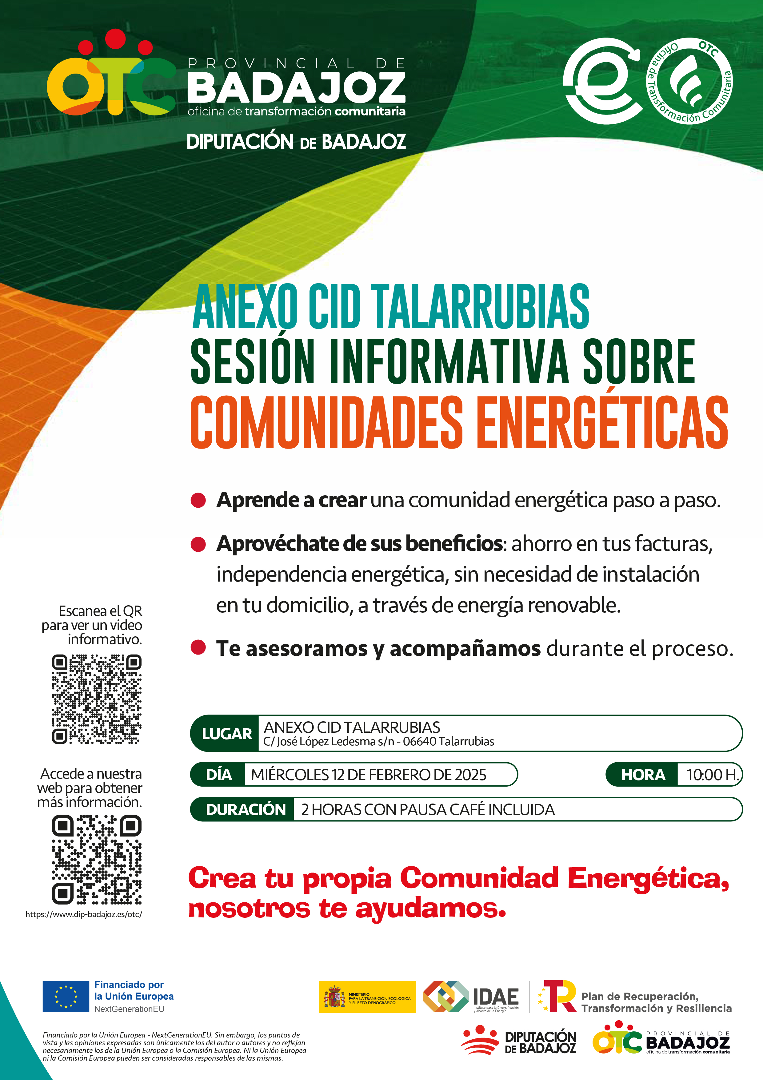 Se adjunta el cartel de la primera jornada sobre Comunidades Energéticas que tendrá lugar en el Anexo CID de Talarrubias el próximo 12 de febrero.