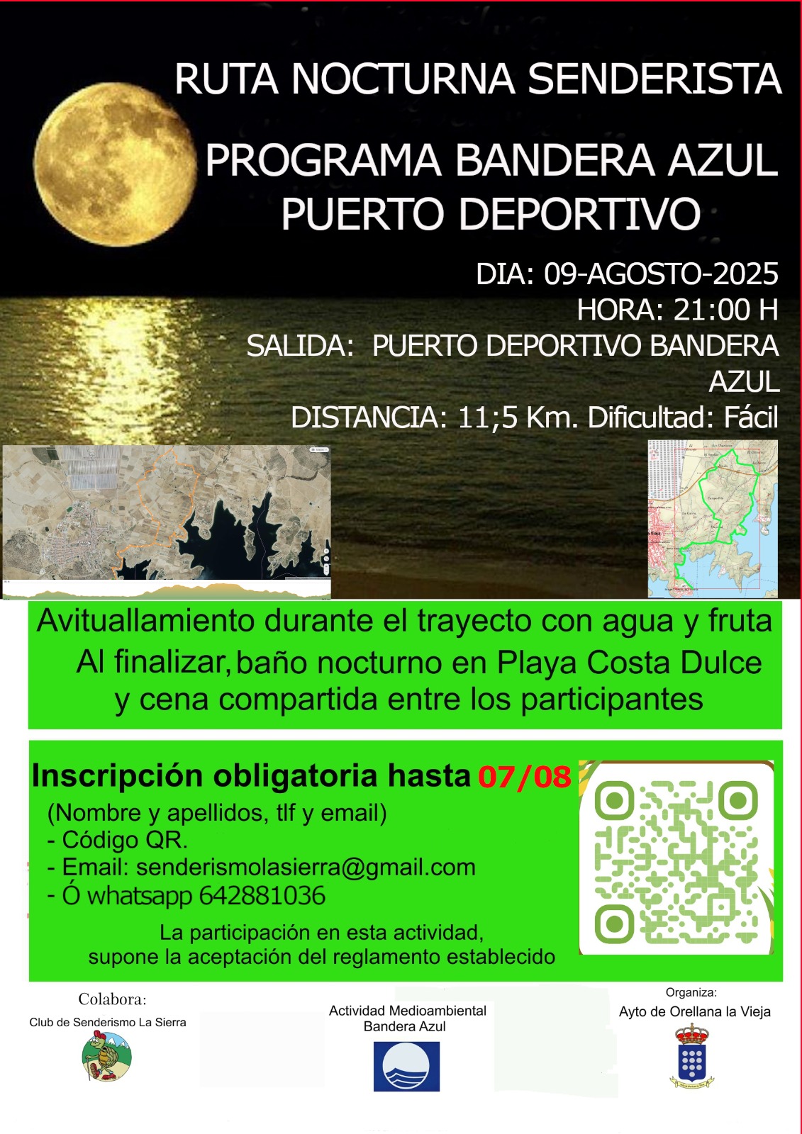 El próximo 9 de agosto a las 21:00 horas se organiza la 2ª Ruta Senderista Bandera Azul 2025 con salida desde el Puerto Deportivo Bandera Azul de Orellana la Vieja. Ruta circular de 11,5 km. Fácil.