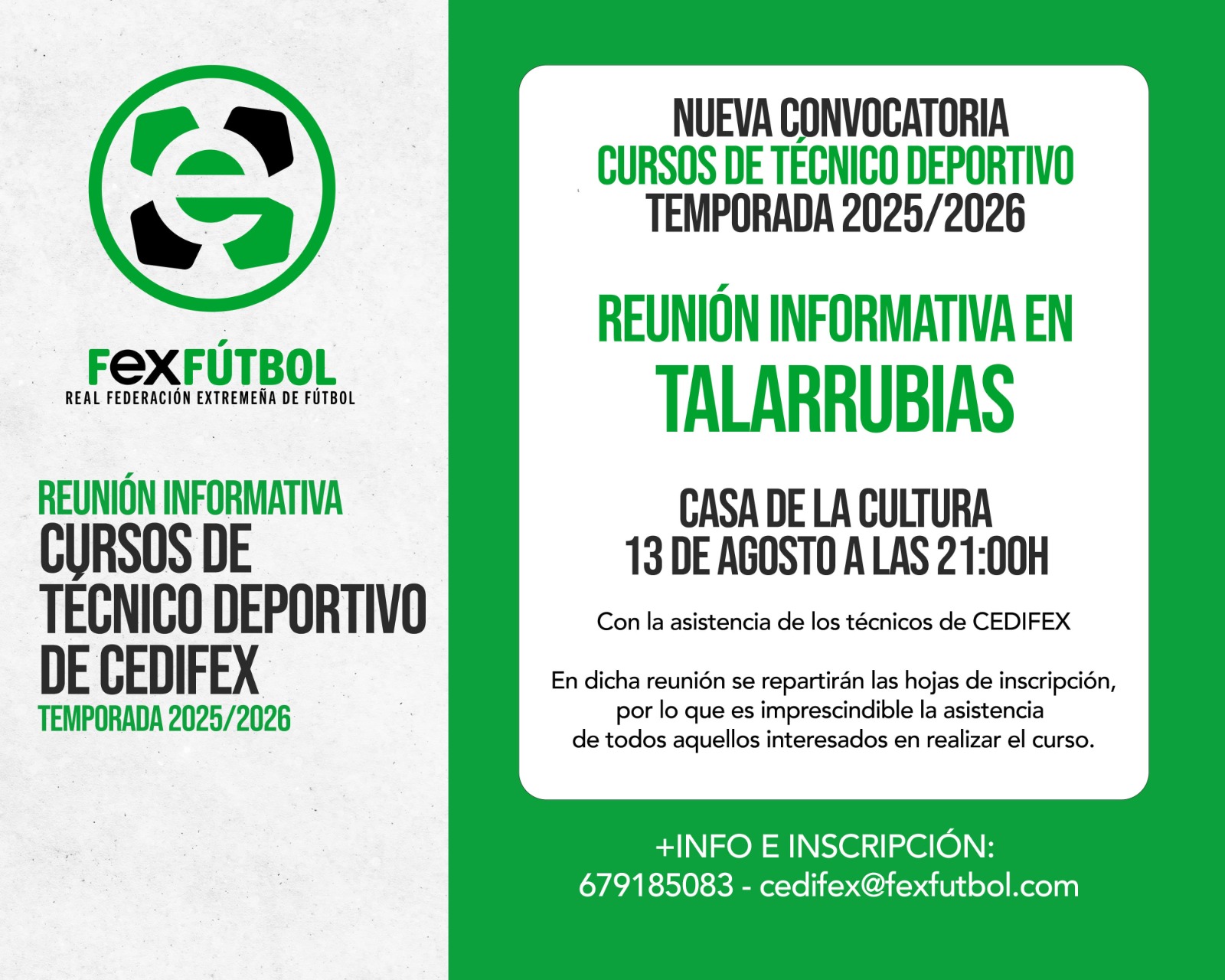 La Real Federación Extremeña de Fútbol organiza una nueva edición de este curso de cara a la temporada 2025/2026. Para ello ha convocado una reunión informativa en la Casa de la Cultura de Talarrubias el próximo 13 de agosto a las 21:00 horas.