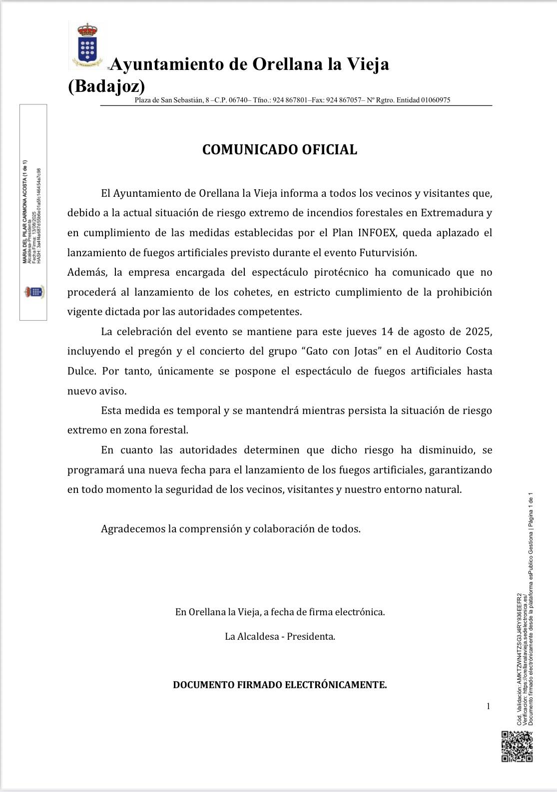 Se adjunta documento con comunicado oficial del Ayuntamiento de Orellana la Vieja