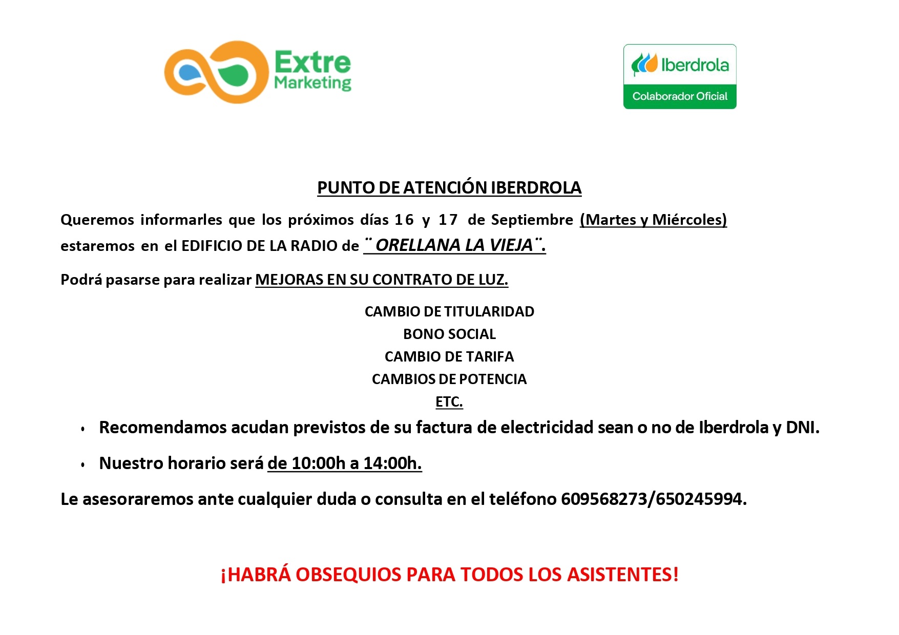 Iberdrola instalará un punto de atención temporal al ciudadano en Orellana la Vieja. Será durante los días 16 y 17 de septiembre y se ubicará en el Edificio Lacimurga, en horario de 10 de la mañana a 2 de la tarde.