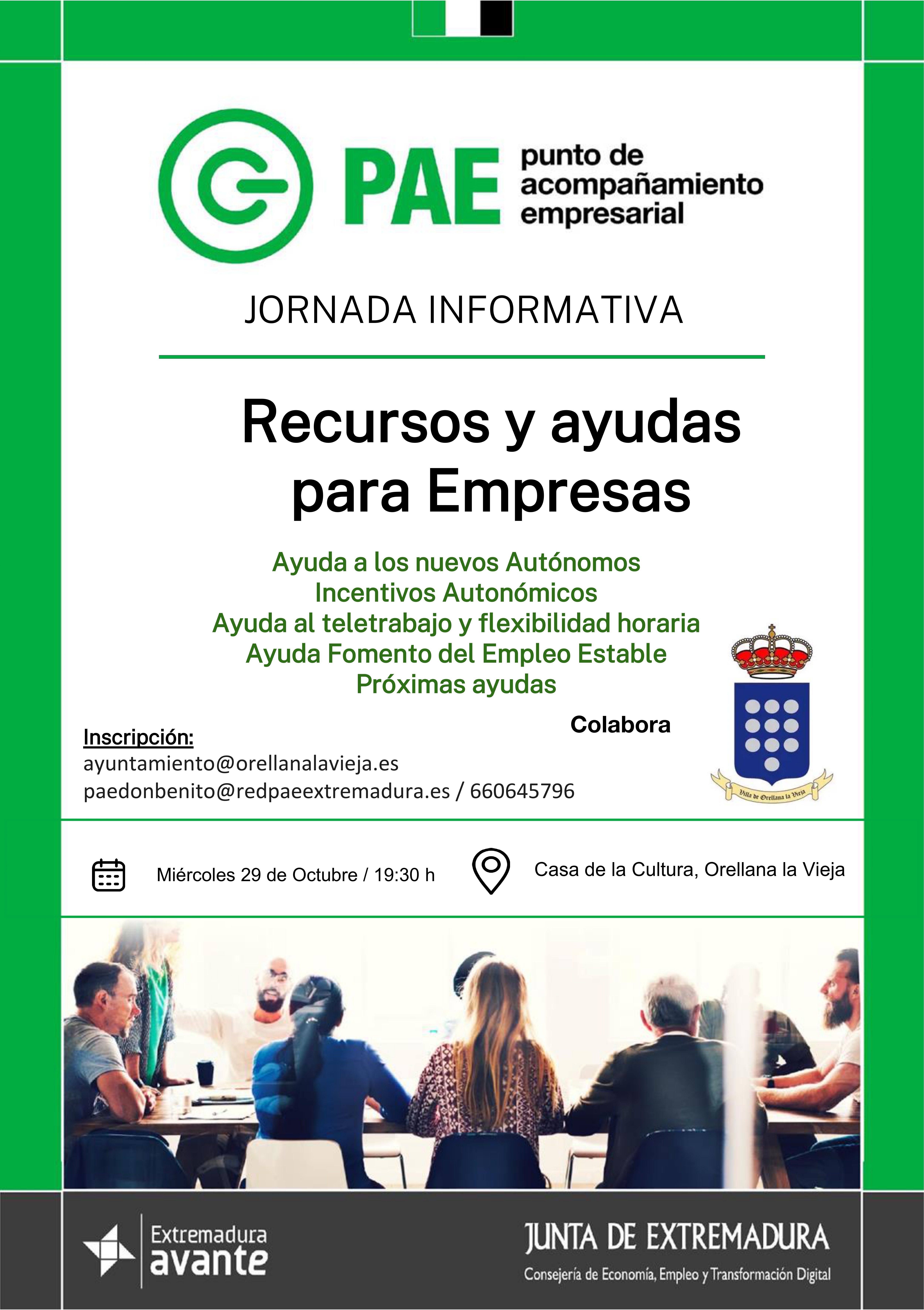 Una jornada impartida por técnicos del Punto de Acompañamiento Empresarial de Don Benito (PAE), de gran interés para todos los empresarios y autónomos de Orellana la Vieja. Recursos disponibles, próximas ayudas, etc.