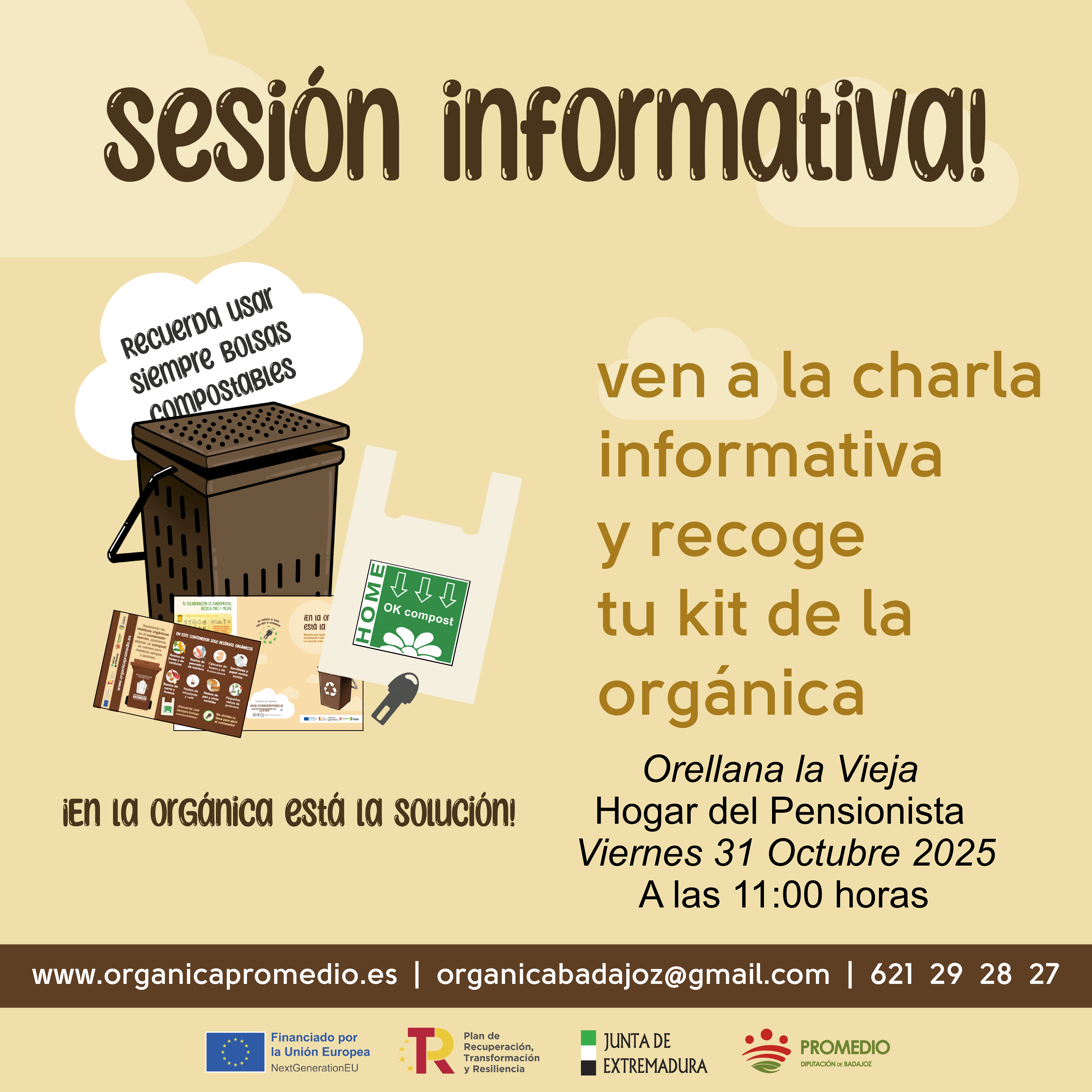 Ven a la charla informativa que se desarrollará el próximo 31 de octubre a las 11:00 horas en el Hogar del Pensionista y llévate gratis tu kit de la orgánica: cubo aireado, bolsas compostables, llave del contenedor y mucha información útil.