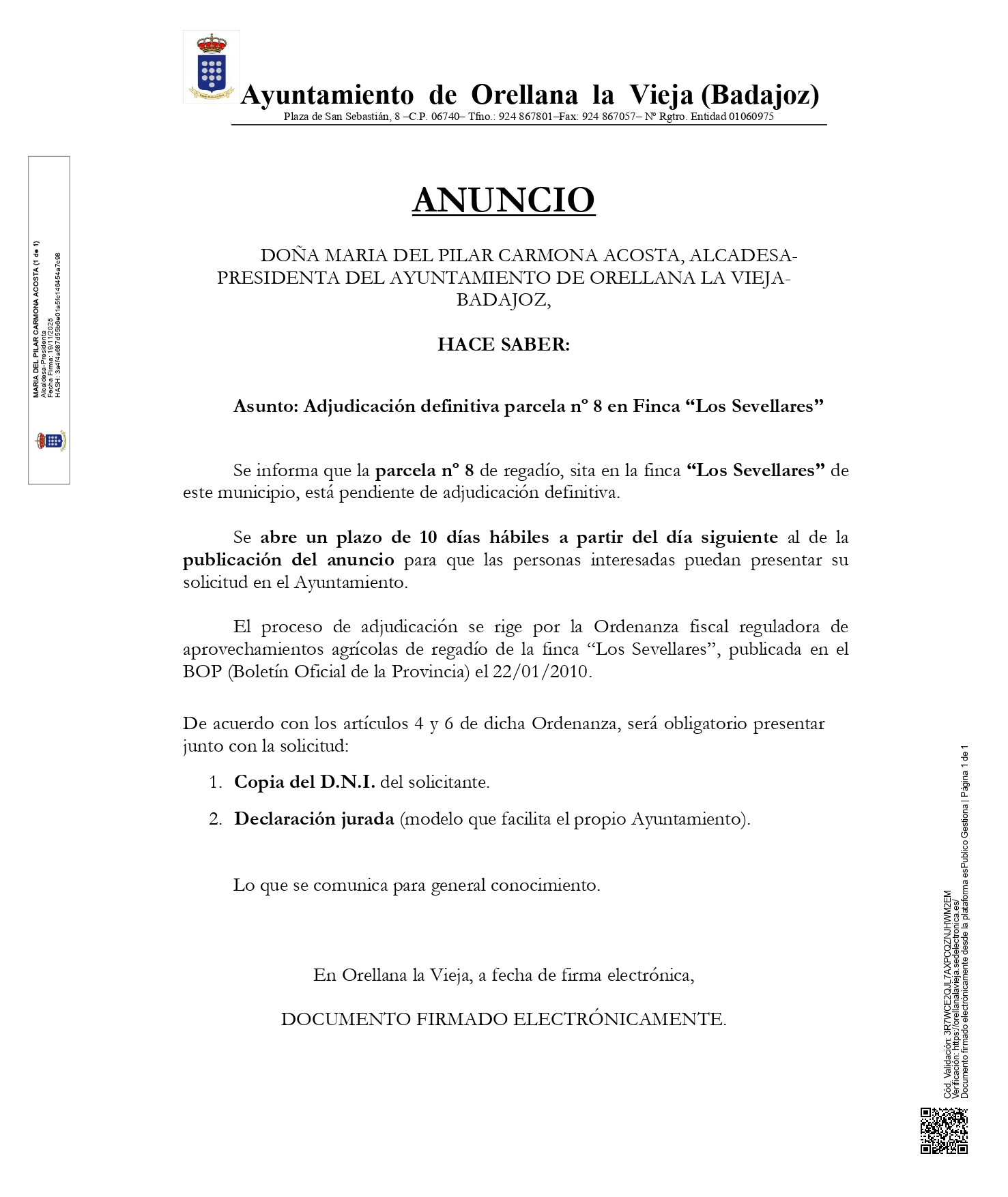 Se informa que la parcela nº 8 de regadío, sita en la finca “Los Sevellares” de este municipio, está pendiente de adjudicación definitiva.