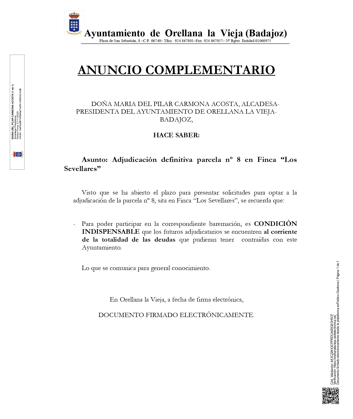 En relación al ANUNCIO- ADJUDICACIÓN DEFINITIVA DE PARCELA EN EL SEVELLAR, se informa que para poder participar en la correspondiente baremación, es CONDICIÓN INDISPENSABLE que los futuros adjudicatarios se encuentren al corriente de la totalidad de las deudas que pudieran tener contraídas con este Ayuntamiento.