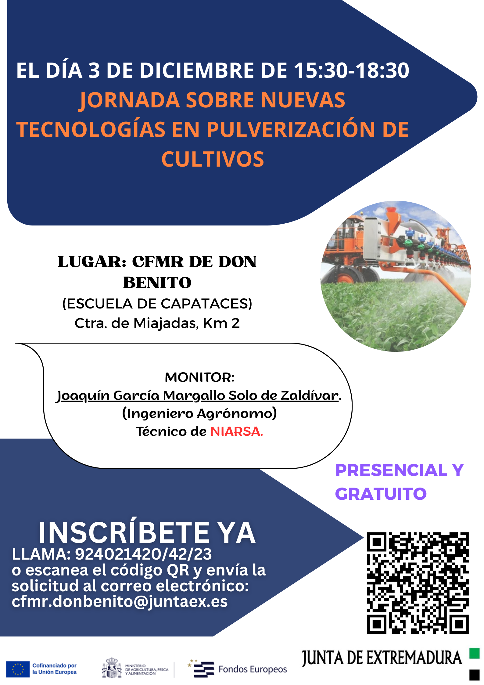 Se adjunta cartel de la jornada de demostración sobre nuevas tecnologías en pulverización de cultivos que se desarrollará el próximo 3 de diciembre entre las 15:30 y las 18:30 horas en el Centro de Formación del Medio Rural de Don Benito (ESCUELA DE CAPATACES) Ctra. de Miajadas, Km 2.