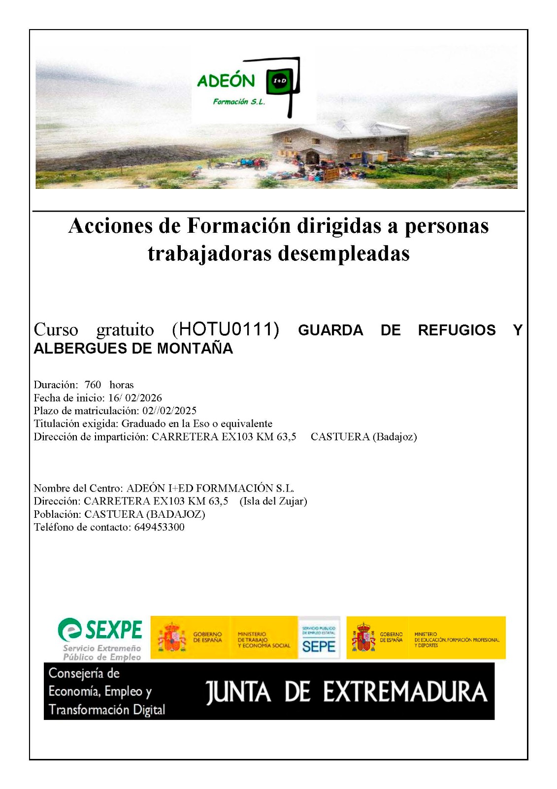 Se adjunta cartel del Curso gratuito de Guarda de Refugios y Albergues de Montaña. Acción formativa dirigida a personas trabajadoras desempleadas, orientada a la adquisición de competencias profesionales para la gestión y atención de refugios y albergues de montaña. El curso tiene una duración total de 760 horas y dará comienzo el 16 de febrero de 2026 en la ISLA DEL ZÚJAR (Castuera).