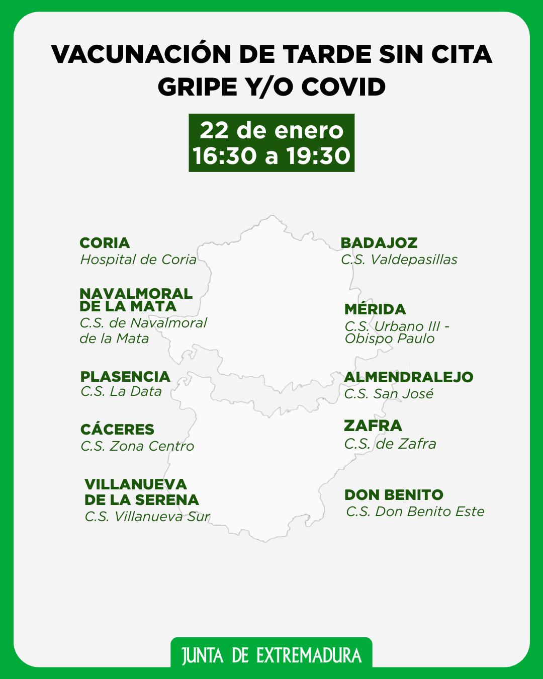 Se adjunta cartel con los lugares de vacunación de gripe y covid en horario de tarde y sin cita previa para hoy jueves 22 de enero. La atención se ofrecerá desde las 16:30 a 19:30 horas.