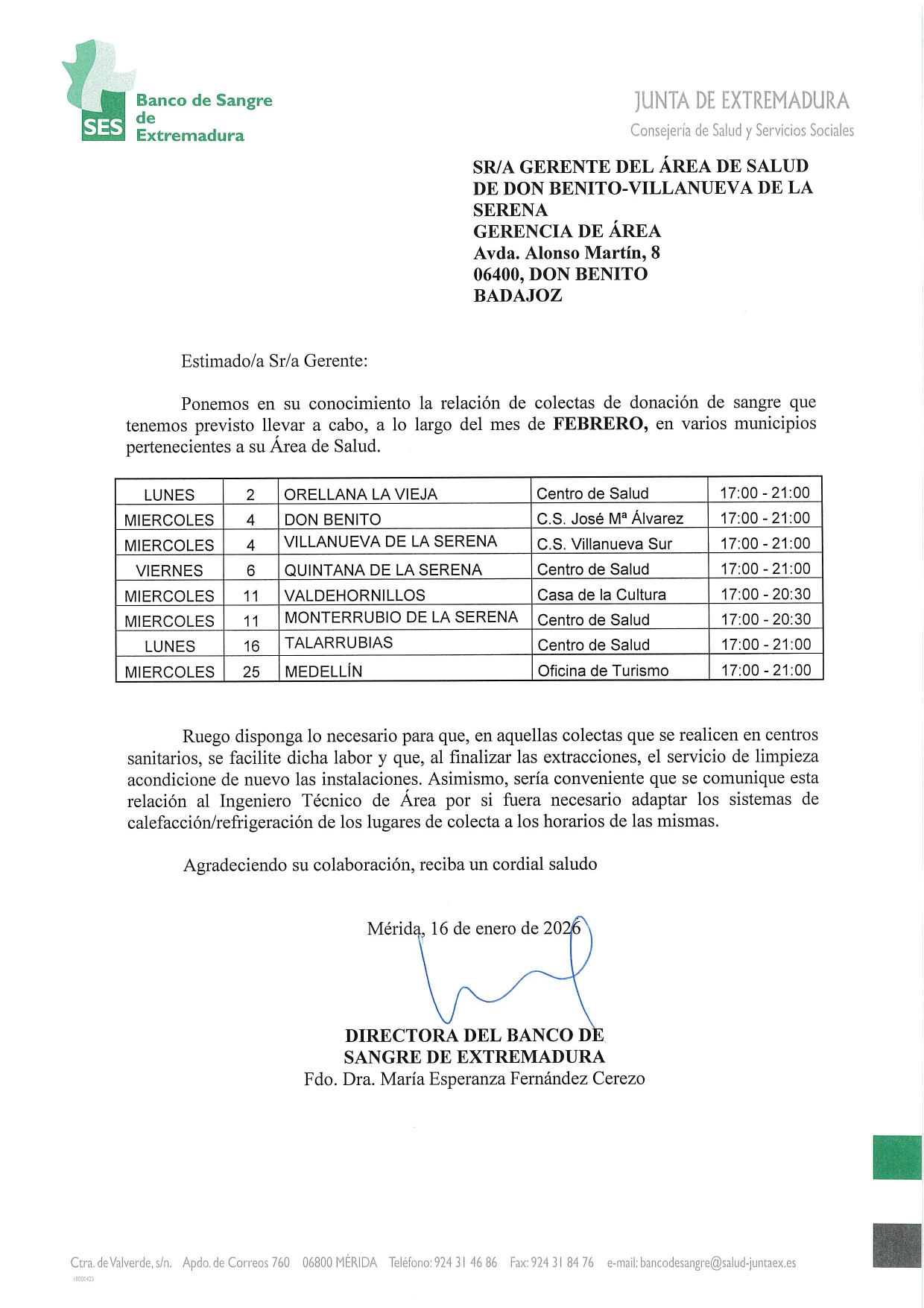 Las extracciones se llevarán a cabo el lunes 2 de febrero, en el nuevo Centro de Salud de Orellana la Vieja, en horario de 17:00 a 21:00 horas.