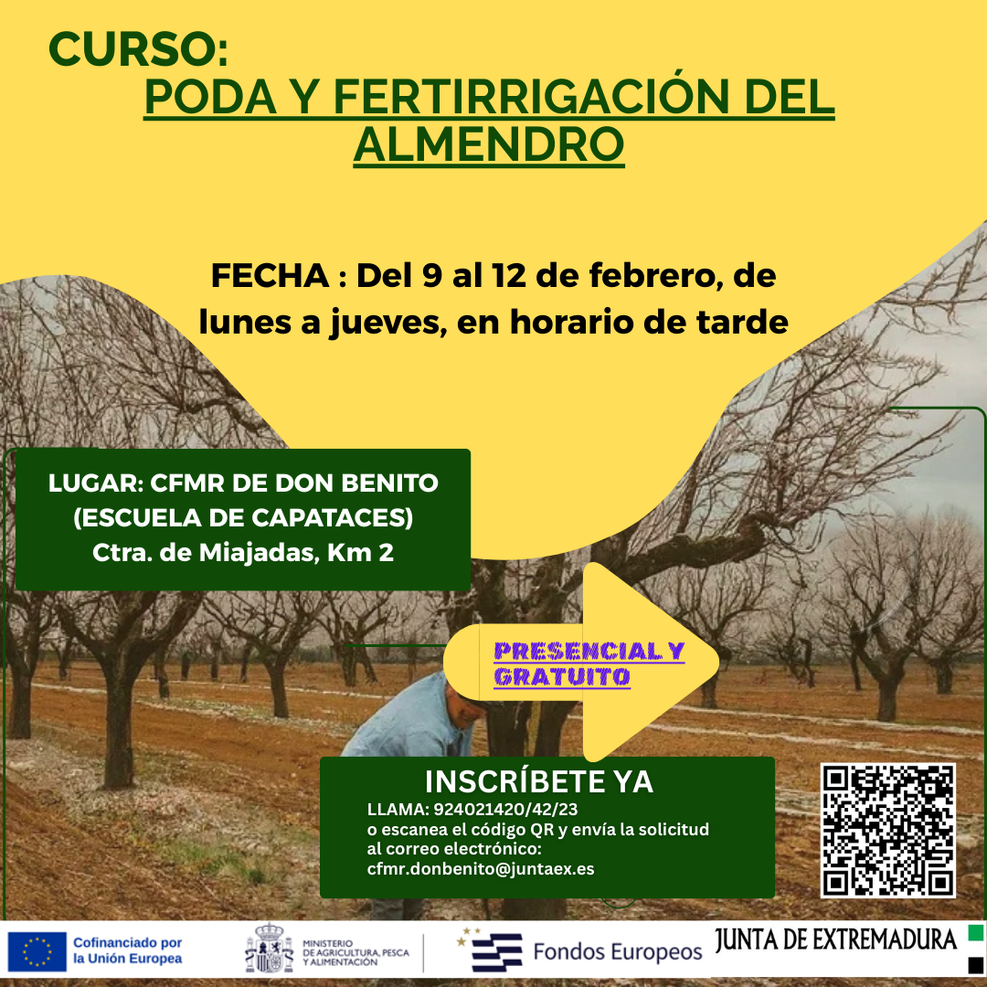 El CFMR de Don Benito (Escuela de Capataces) acoge el curso “Poda y fertirrigación del almendro”, una acción formativa presencial y gratuita dirigida a profesionales y personas interesadas en el cultivo del almendro.
