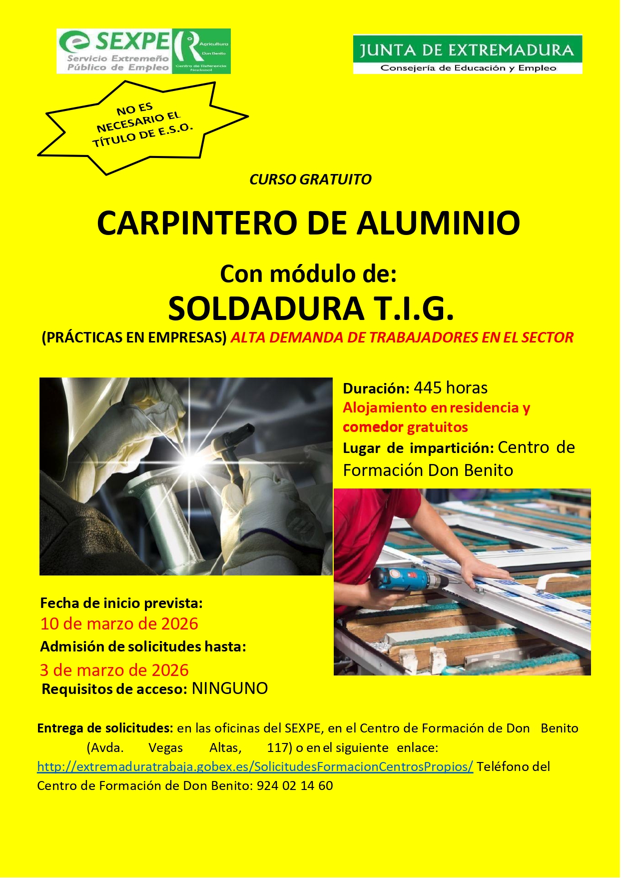 Entrega de solicitudes: en las oficinas del SEXPE o en el siguiente enlace: http://extremaduratrabaja.gobex.es/SolicitudesFormacionCentrosPropios/