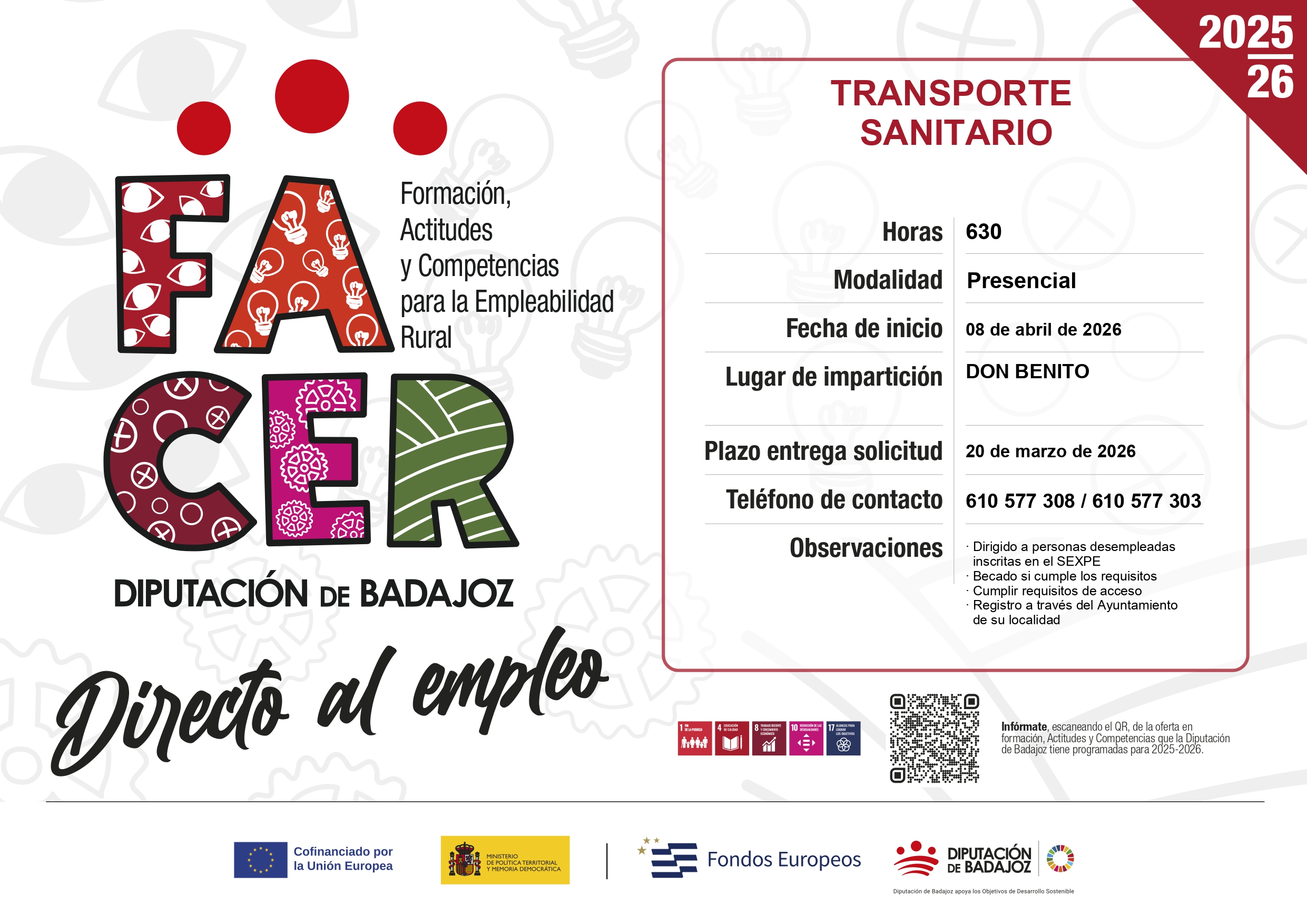 Desde el Servicio de Capacitación para el Empleo y Formación Profesional de la Diputación de Badajoz se pone en marcha el proceso de recepción de solicitudes para el curso, «TRANSPORTE SANITARIO (SANTO208)», TOTALMENTE GRATUITO, de 630 Horas de duración que se realizará en modalidad PRESENCIAL, en DON BENITO.