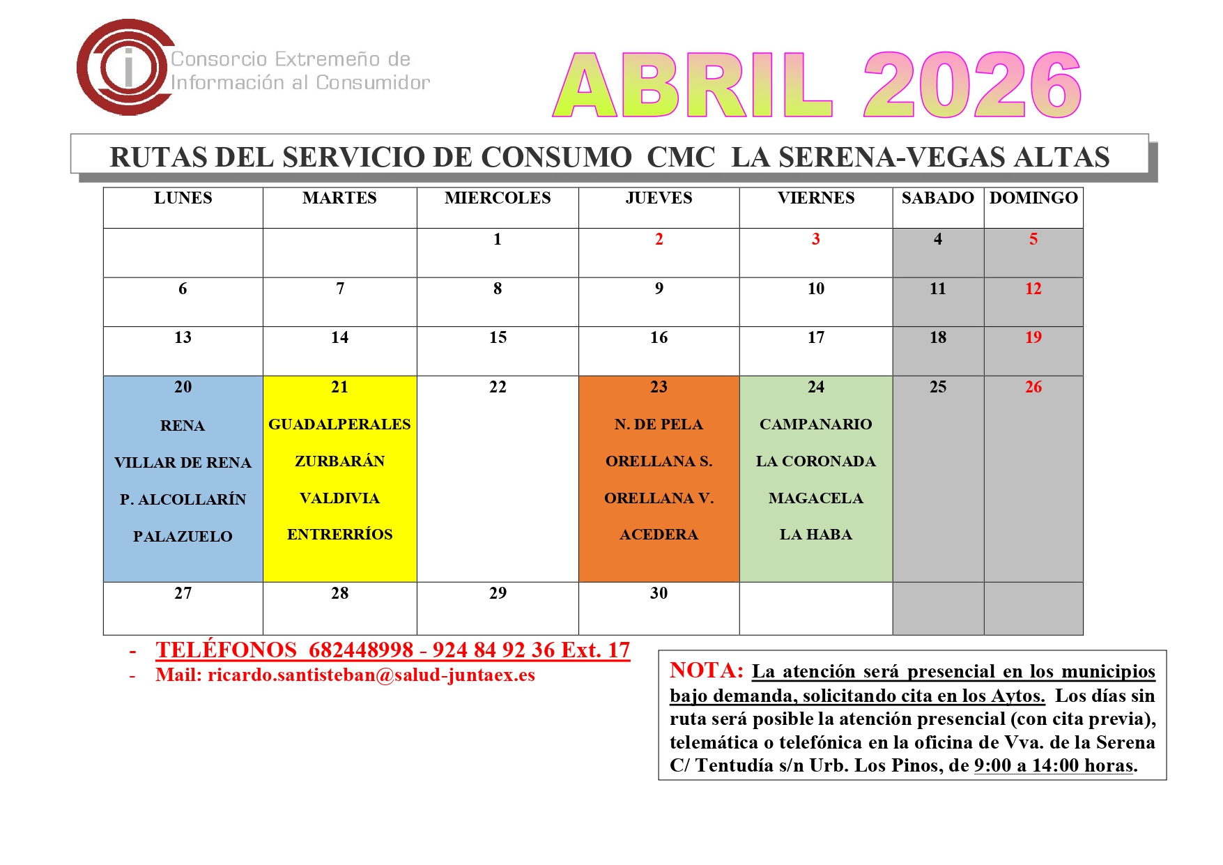 Se remite el cuadro de rutas del servicio de consumo del mes de Abril de 2026, del Centro Mancomunado de Consumo La Serena-Vegas Altas.